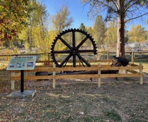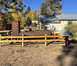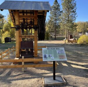 The trail features the reconstruction of the 3-Stamp mill by Sam Aarons, a dredge sprocket that ran the “digging ladder” on a dredge with a stand built by Dave Selene, a compressor donated by the Al Larsen family from the Golden Chariot mine and other mining artifacts owned by the Foundation.Â